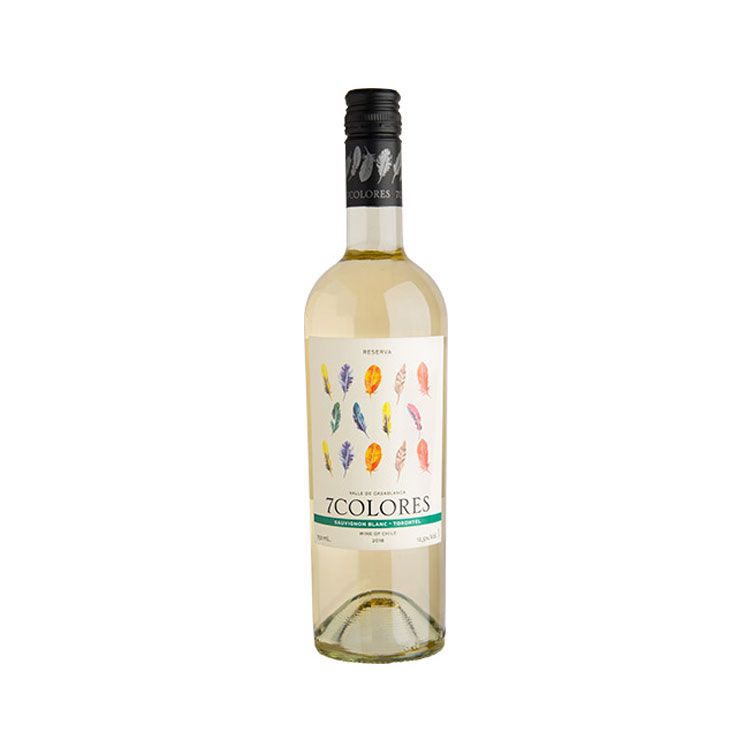 Rượu vang trắng Chile 7 COLORES Sauvignon Blanc-Torontel có màu vàng nhạt ánh xanh tươi sáng. Rượu vang mang hương thơm đặc trưng của giống nho trắng Sauvignon Blanc như hương thơm của các loại hoa quả như cam quýt, thảo dược, táo xanh và các khoáng chất.